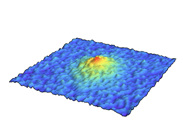 左の図は2016年度後期の課題演習B6で学生が作製した、BEC転移を起こすRb原子の2次元運動量分布のアニメーションです。原子の冷却が進むにつれて運動量がゼロの領域(画像の中心部)に原子が集まっていく(=BEC相が成長していく)様子が分かります。このときの原子集団は200 nK以下の温度にまで冷却されています。このような極低温下で起こる不思議な量子物質の世界に是非触れてみて下さい。